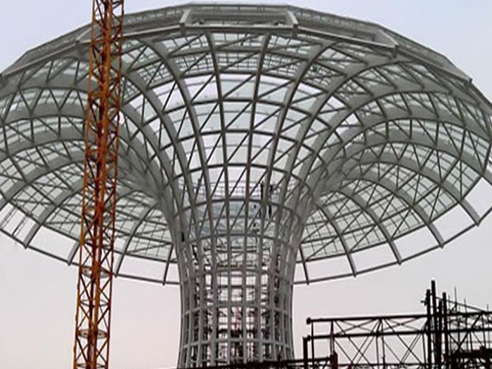 二、球形网架结构因其结构新颖,受力合理,自重轻、用钢量低等优点。如大型体育场馆球形太仓螺栓球网架、公共场馆球形网架、电厂太仓螺栓球网架、水泥工业球形网架、仓储物流球形网架、太仓干煤棚工业球形网架、太仓收费站太仓加油站球形网架、展览中心、影剧院、商场、航站楼、候车厅、工厂太仓车间、仓库、电视塔等球形螺栓球节点网架。国内球形网架结构主要分为:太仓焊接球节点网架及螺栓球节点网架两种。螺栓球节点网架其构件工厂内加工量较大,现场安装便捷,适用于现场工期紧,太仓施工条件、用电量受制约,网架形状复杂、太仓杆件定位困难的异形结构。螺栓球节点球形网架系统基本由太仓杆件、螺栓球、支撑支座等组成。按照节点形式可分为交叉太仓桁架体系、四角锥体系、三角锥体系等。支撑方式多为固定支座支撑。对于大面积、大跨度及有特殊受力或伸缩要求的网架结构可采用橡胶支座、滑移支座、球铰支座等支撑形式,以满足结构自身的受力稳定、均衡,便于内力释放等设计要求。